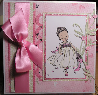 This pretty little flower girl is another Mo Manning digi stamp, coloured with water colour paints. I used Nit Wit papers, the ribbon is from Hobbycraft.